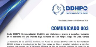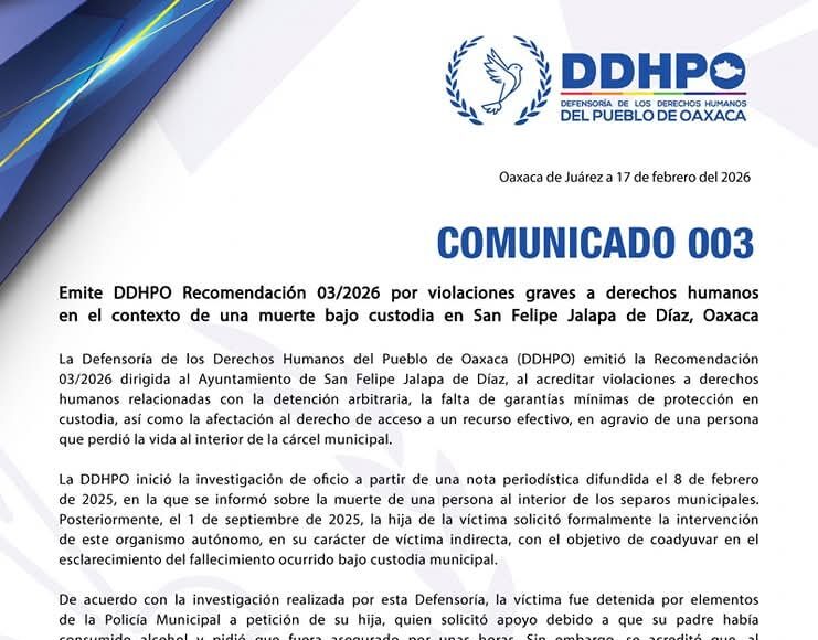 Emite DDHPO Recomendación 03/2026 por violaciones graves a derechos humanos en el contexto de una muerte bajo custodia en San Felipe Jalapa de Díaz,...
