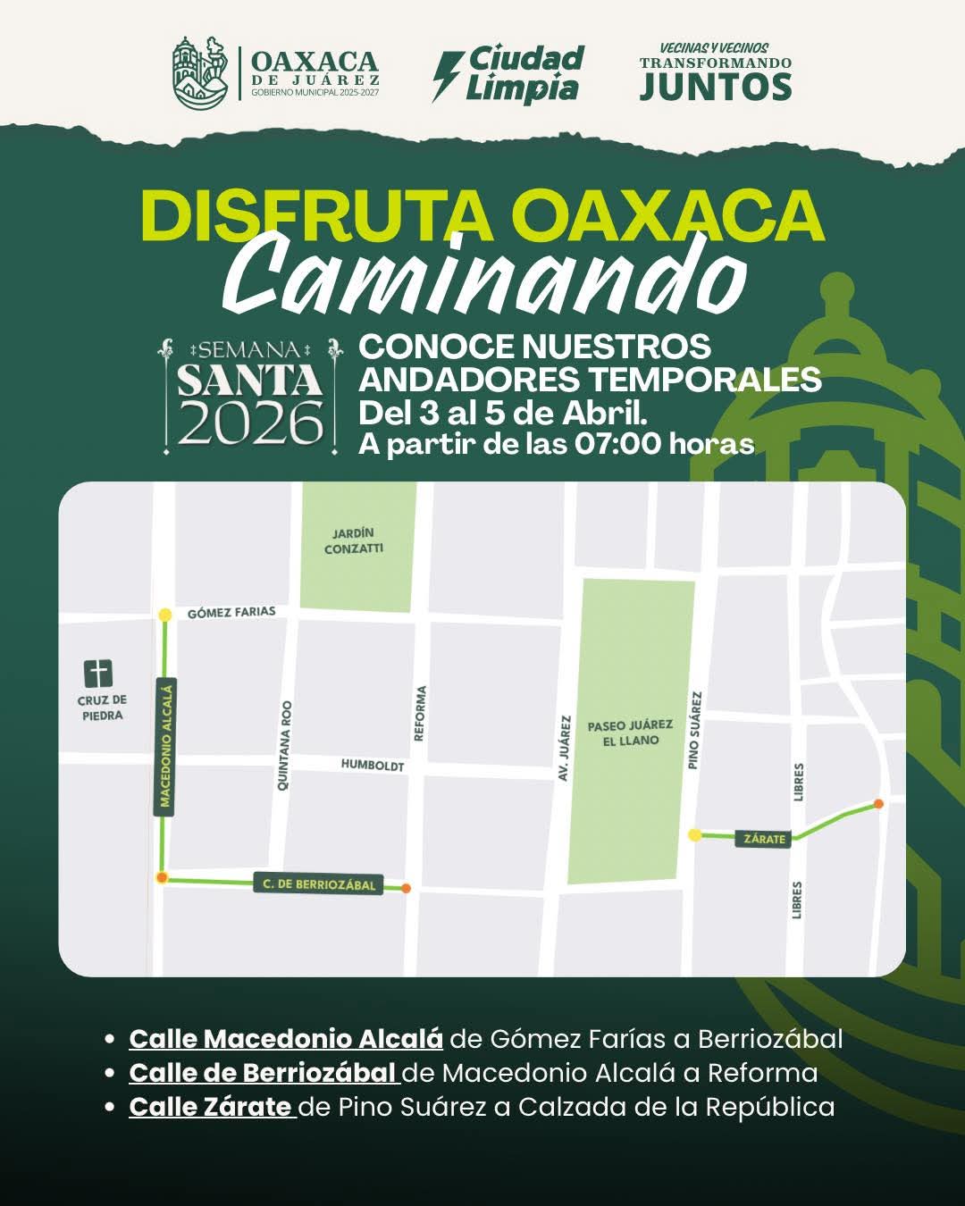 Del 3 al 5 de abril el Municipio de Oaxaca de Juárez activó andadores temporales en el Centro Histórico para que disfrutes la ciudad de forma más ordenada, segura y caminable.