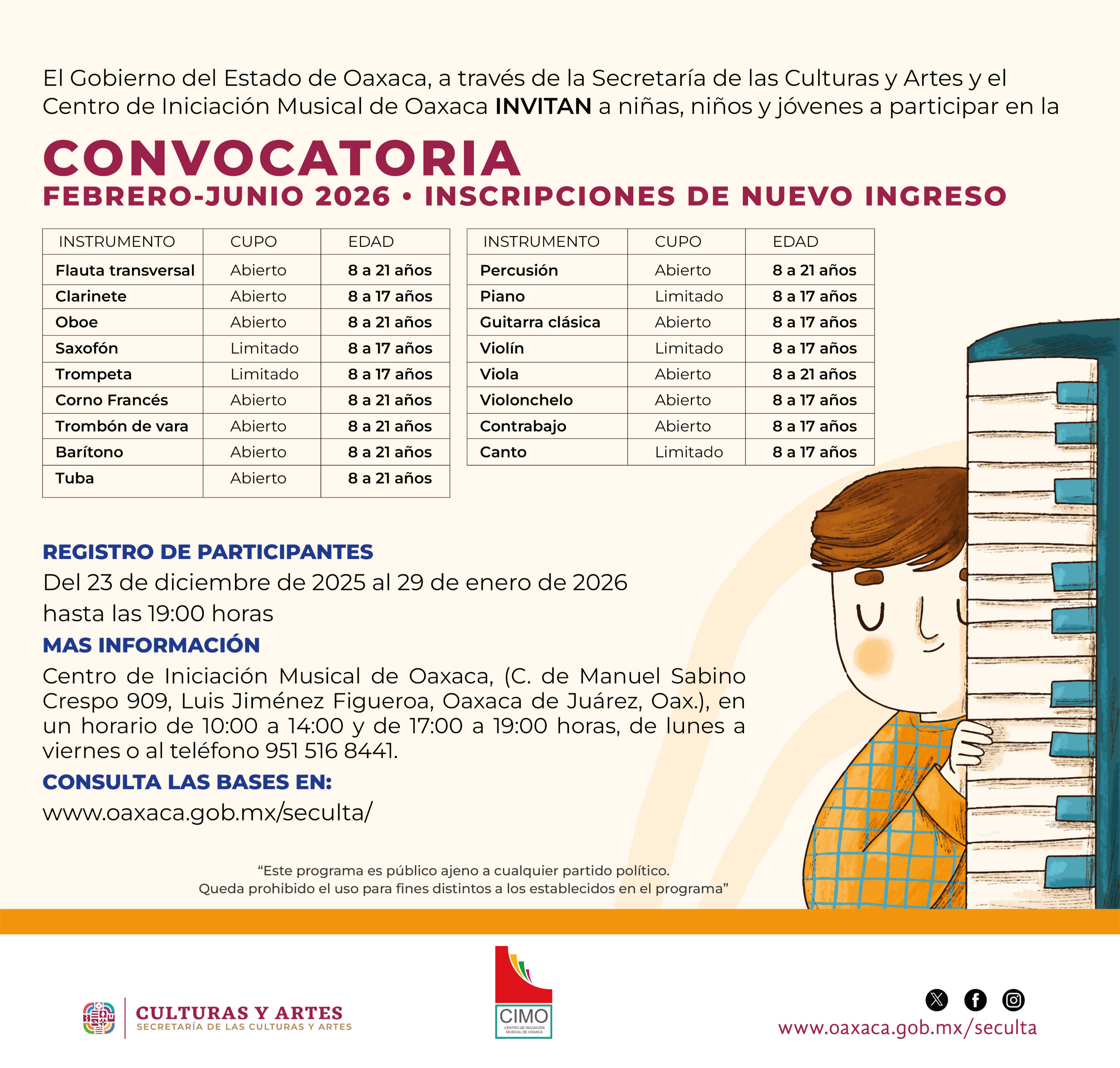 Oaxaca de Juárez Oax. 23 de diciembre de 2025.- El Gobierno del Estado invita a niñas, niños y jóvenes de entre 8 y 21 años a participar en la convocatoria de nuevo ingreso del Centro de Iniciación Musical de Oaxaca (CIMO), para el periodo febrero-junio 2026.