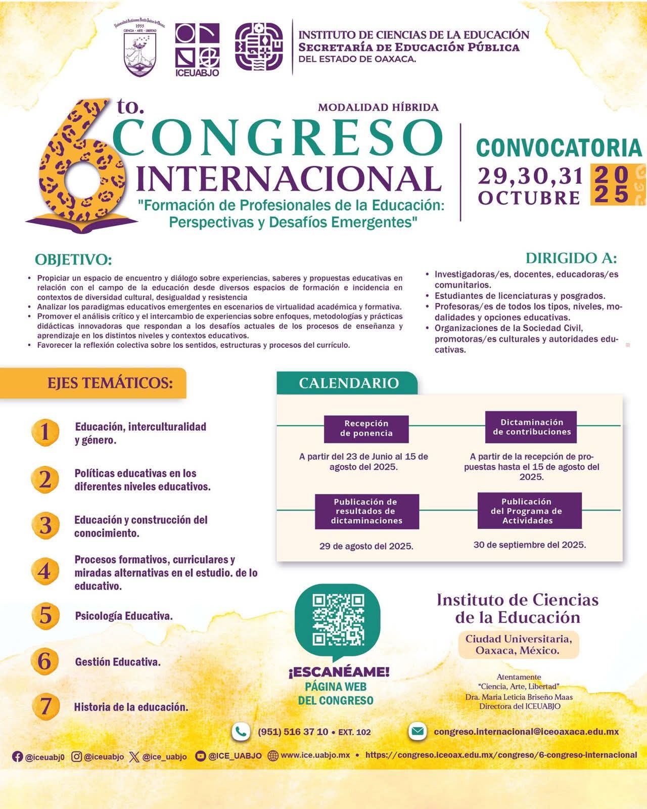 Escanea el código dentro del cartel o a través del siguiente enlace: https://congreso.iceoax.edu.mx/congreso/6-congreso-internacional para mayor información.