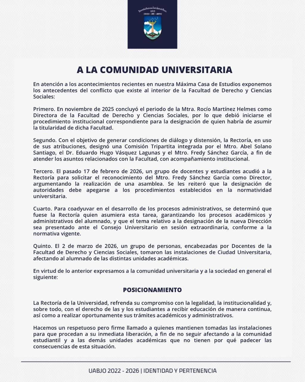 El funcionariado Universitario, Secretarías, Directoras y Directores de las Unidades Académicas de la Universidad Autónoma “Benito Juárez” de Oaxaca, respaldamos la decisión de nuestro Rector respecto al conflicto en la Facultad de Derecho y Ciencias Sociales y expresamente apoyamos las acciones que se deben llevar a cabo para su solución.