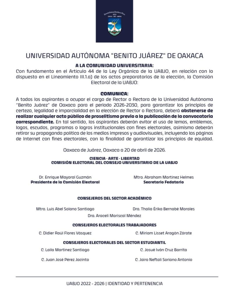 Inicio Estatal A la comunidad universitaria de la UABJO Estatal A la comunidad universitaria de la UABJO abril 20, 2026 103 Compartir Comparte esto: Share on X (Se abre en una ventana nueva) X Comparte en Facebook (Se abre en una ventana nueva) Facebook Me gusta esto:Me gusta Cargando... Artículos relacionadosMás del autor Con espacios deportivos nuevos, Oaxaca vivirá al máximo el Mundial de Fútbol Confianza, certeza y seguridad favorecieron inversión mayor a 277 mil mdp en Oaxaca Coordinación y resultados para beneficio de las vecinos y vecinas de la ciudad: Ray Chagoya