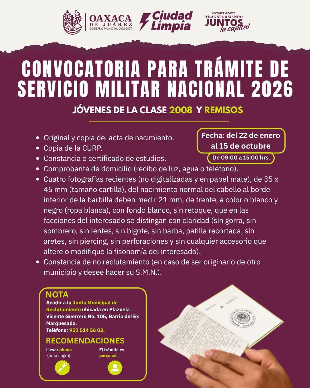 Oaxaca de Juárez, Oax. 26 de enero de 2026.— El Municipio de Oaxaca de Juárez informó la apertura de la convocatoria para el trámite del Servicio Militar Nacional (SMN) 2026, dirigida a jóvenes de la clase 2008, así como a remisos que deseen cumplir con esta obligación cívica.