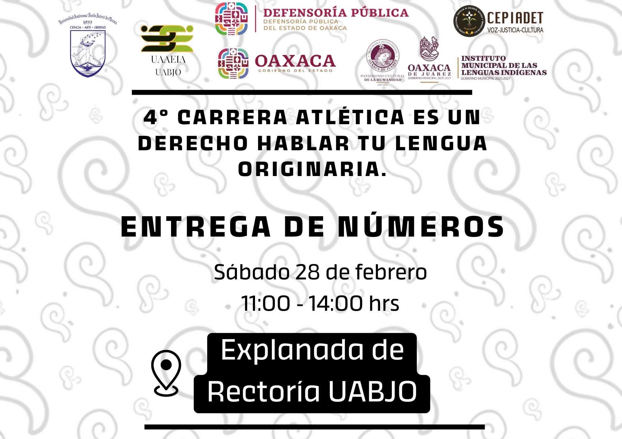 La entrega de números de la 4ta Carrera Atlética “Es un derecho hablar tu lengua originaria” se llevará acabo el Sábado 28 de febrero de 11:00 am a 2:00 pm en la Explanada de Rectoría, C.U.