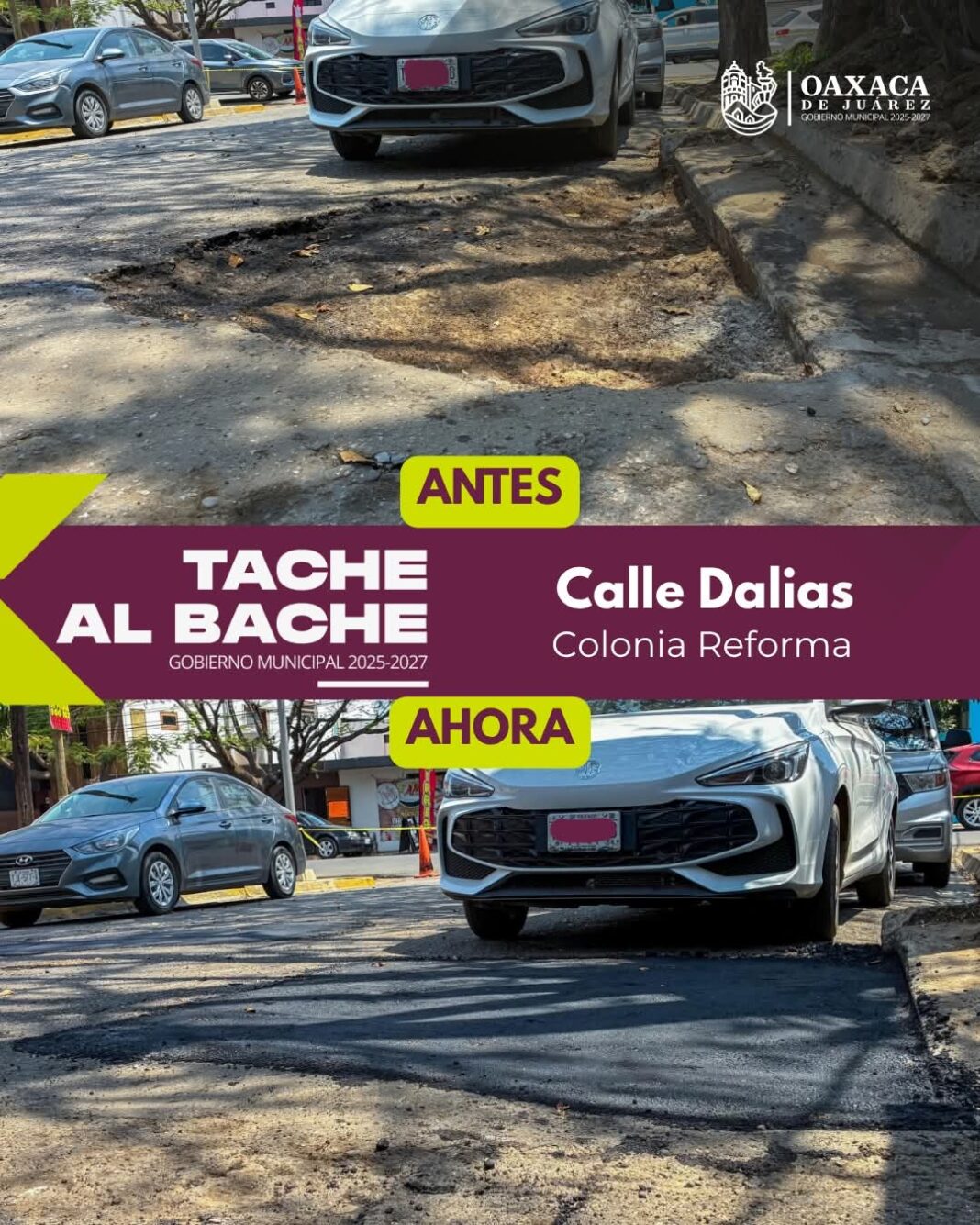 Como parte del programa Tache al Bache, se realizaron trabajos en la calle Dalias, en el tramo de avenida Belisario Domínguez a calle Sabinos, en la colonia Reforma.