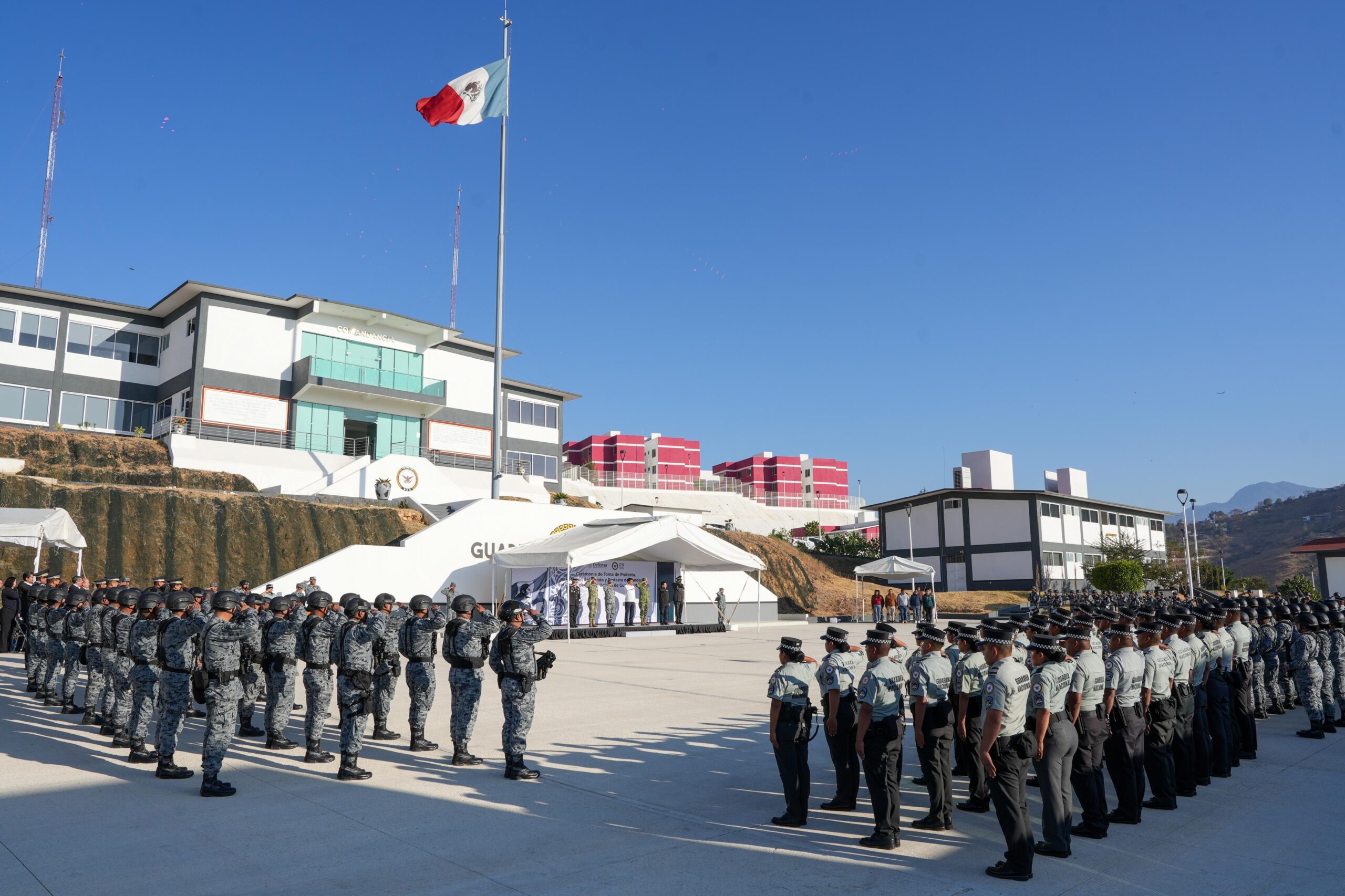Santa Cruz Xoxocotlán, Oax. 13 de febrero de 2026.- El Gobernador Salomón Jara Cruz atestiguó la ceremonia de posesión de cargo del coronel Rubén Olivares Robles, quien a partir del pasado 1 de febrero funge como comandante de la Trigésimo Octava Coordinación de la unidad de la Guardia Nacional (GN), ubicada en Santa Cruz Xoxocotlán.