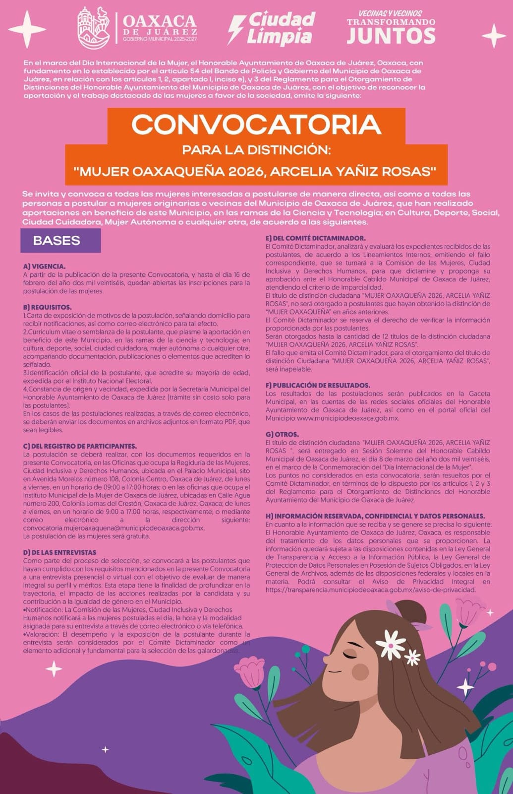 Oaxaca de Juárez, Oax. 10 de febrero de 2026.- En el marco de la conmemoración del Día Internacional de la Mujer, el Honorable Ayuntamiento de Oaxaca de Juárez emitió la convocatoria para la distinción ciudadana “Mujer Oaxaqueña 2026, Arcelia Yañiz Rosas”, con el objetivo de reconocer la trayectoria, el esfuerzo y las contribuciones relevantes de mujeres originarias o vecinas del municipio en beneficio de la sociedad.