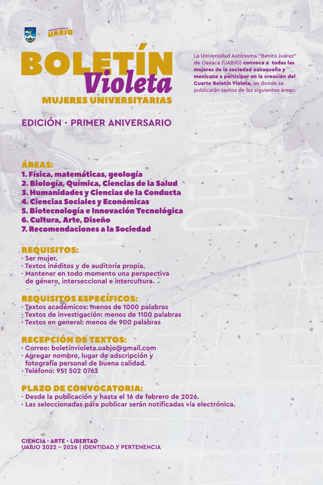 La UABJO invita a todas las mujeres oaxaqueñas y mexicanas a participar en la cuarta edición del “Boletín Violeta”, a continuación se encuentran los requisitos y áreas en las que pueden participar.