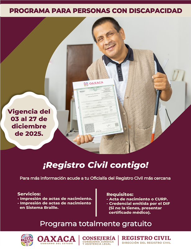 Oaxaca de Juárez, Oax. 3 de diciembre de 2025.- El Gobierno del Estado a través de la Dirección del Registro Civil, brinda del 3 al 27 de diciembre, impresiones gratuitas de actas de nacimiento y de sistema Braille a las personas con discapacidad de la entidad.