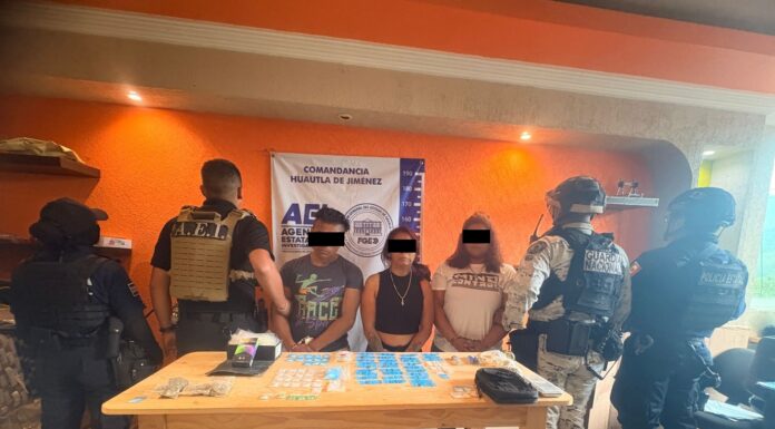 Fiscalía de Oaxaca, Guardia Nacional y Policía Estatal catean punto de venta de cristal, detienen a tres personas originarias de Veracruz y Campeche