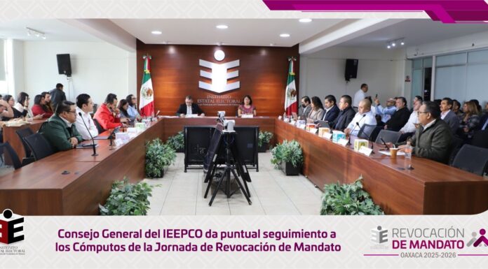 Este lunes, el Consejo General del Instituto Estatal Electoral y de Participación Ciudadana de Oaxaca (IEEPCO) continuó con la Sesión de Seguimiento al Desarrollo de los Cómputos de la Jornada de Revocación de Mandato, informando un avance del 90.37 % en la captura de...