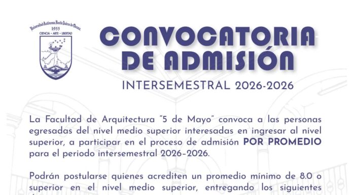 A las personas egresadas del nivel medio superior, la convocatoria de admisión intersemestral por promedio para la Facultad de Arquitectura "5 de Mayo" sigue abierta hasta el 26 de enero.