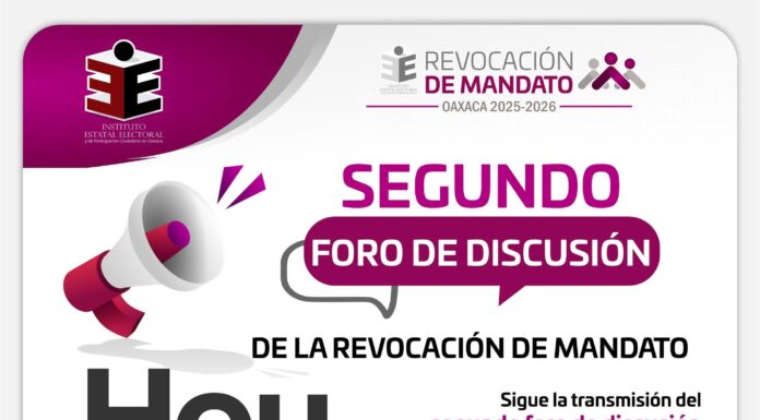 💬Hoy a las🕕6:00 p.m., a través de las redes sociales del #IEEPCO, no te pierdas el segundo Foro de Discusión de la #RevocacióndeMandato, un espacio para informarse, analizar y reflexionar sobre este ejercicio democrático en #Oaxaca.