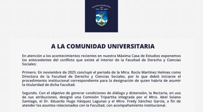 El funcionariado Universitario, Secretarías, Directoras y Directores de las Unidades Académicas de la Universidad Autónoma "Benito Juárez" de Oaxaca, respaldamos la decisión de nuestro Rector respecto al conflicto en la Facultad de Derecho y Ciencias Sociales y expresamente apoyamos las acciones que se deben...