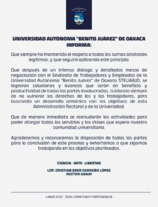 Inicio Estatal Comunicado UABJO Estatal Comunicado UABJO febrero 10, 2026 123 CompartirA la Comunidad Universitaria. A la Sociedad en general. #UABJO #InmensamenteUABJO #Oaxaca Comparte esto: Share on X (Se abre en una ventana nueva) X Comparte en Facebook (Se abre en una ventana nueva) Facebook Me gusta esto:Me gusta Cargando... Artículos relacionadosMás del autor ¡¡¡NO ES MENTIRA, ES UNA VERDAD!!! UABJO Y SCJN FIRMAN CONVENIO PARA IMPLEMENTAR LA CÁTEDRA “BENITO JUÁREZ” Consejo General del IEEPCO resuelve sobre elecciones en Sistemas Normativos Indígenas y aprueba Plan Anual de Trabajo de la Contraloría General