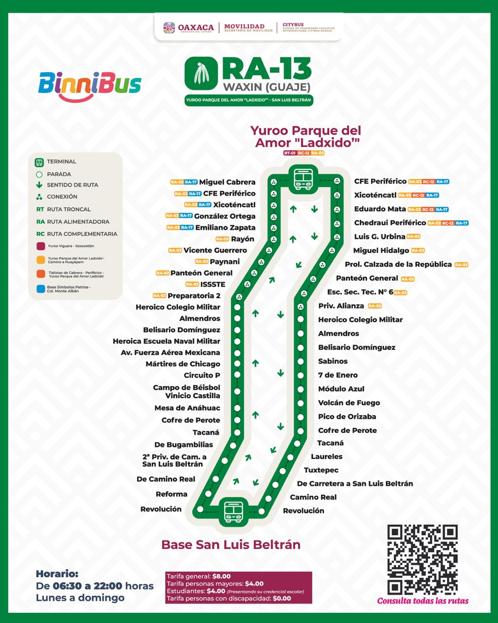 - Se trata de las líneas RA-13 “Waxin”, que va de la terminal Yuroo Parque del Amor “Ladxidó” a la agencia de policía San Luis Beltrán, y RC-06 “Mondok”, que une a San Jacinto Amilpas con el Camino a Huayápam