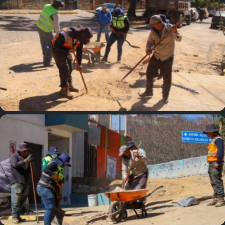 El gobierno municipal de Oaxaca de Juárez realiza trabajos de bacheo en la calle Marcos Pérez, en el tramo de Carretera del Fortín a calle Progreso, como parte del programa Tache Al Bache.