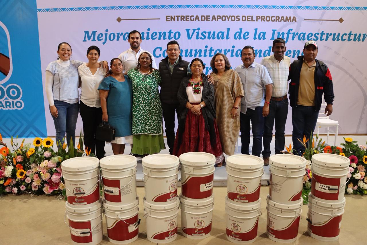 Oaxaca de Juárez, Oax. 18 de noviembre de 2025.- El Gobierno de Oaxaca entregó a 140 autoridades municipales, apoyos del Programa de Mejoramiento Visual de la Infraestructura Comunitaria Indígena y Afromexicana, que contribuye al fortalecimiento de los espacios colectivos.