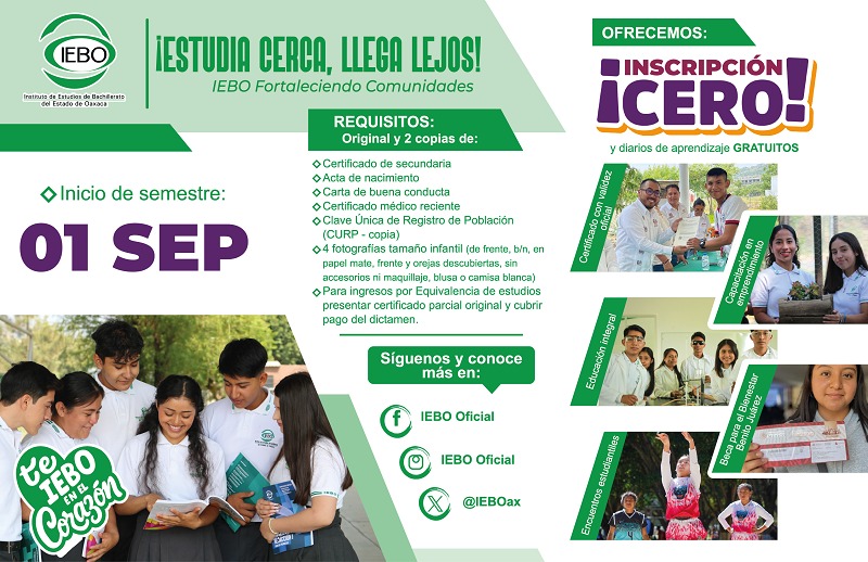 Oaxaca de Juárez, Oax. 4 de febrero de 2026.- Como parte del compromiso del Gobierno del Estado con la transformación educativa y el bienestar social, el Instituto de Estudios de Bachillerato del Estado de Oaxaca (IEBO) invita a las y los egresados de secundaria a formar parte de su comunidad escolar para el próximo ciclo lectivo.