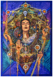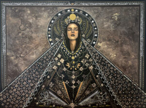 En la “Catrina” quise retratar su alma con flores. Ella mira una mariposa, el único ser vivo del cuadro, que representa el alma. Es la Catrina extrañando la vida. En “Inmaculada” representé a una deidad femenina poderosa, geométrica, fuerte. No una virgen triste, sino una diosa amorosa y sabia.
