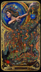 La inspiración está siempre presente. Un libro, una canción, una película… cualquier cosa me enciende una idea. Trabajo en el tarot, en collages, intervengo mis propios cuadros. Para algunos parece caótico, para mí es como ser un niño en dulcería: jugar, crear, divertirme.