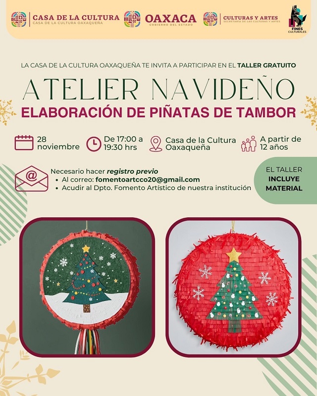 - Las niñas, niños y adolescentes a partir de los 12 años podrán participar en el “Atelier navideño: elaboración de piñatas de tambor”. Se requiere registro previo.