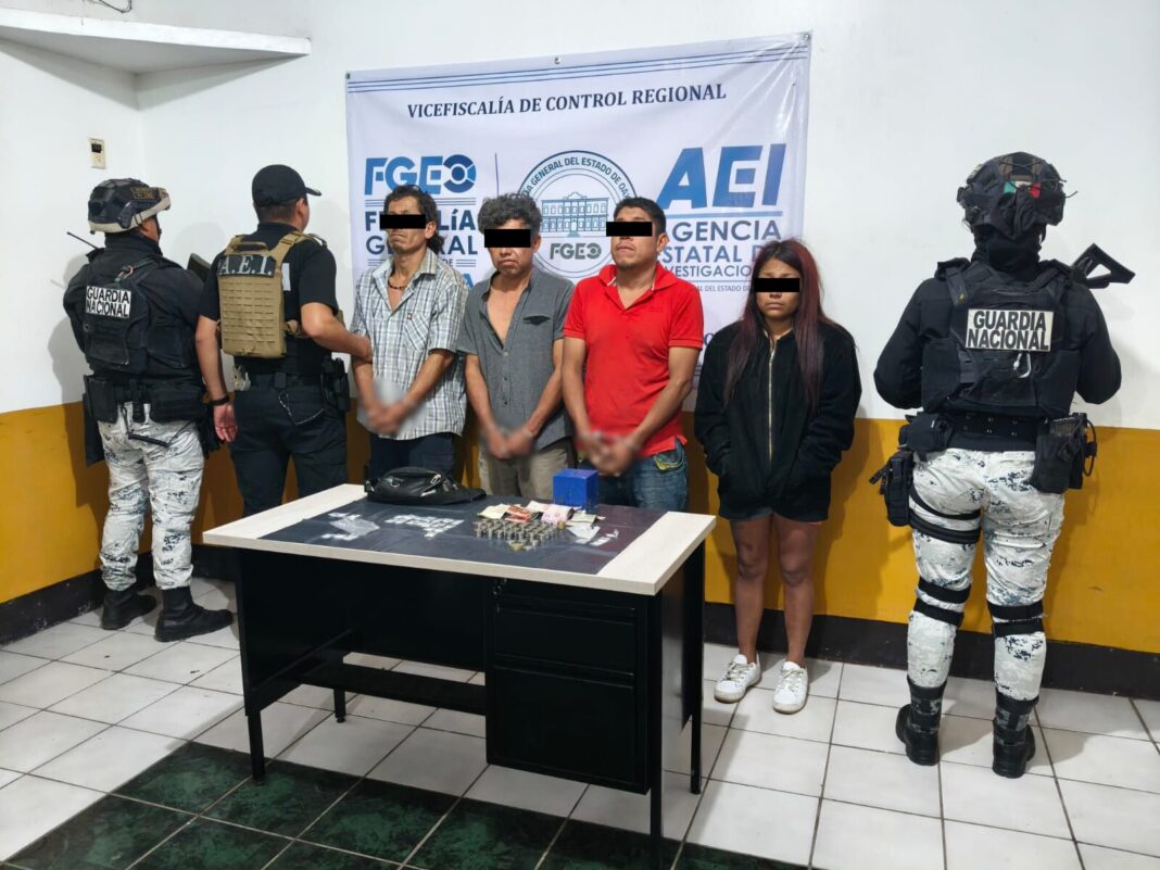 En el interior del inmueble detuvieron a cuatro personas: una mujer identificada como S.B.V., alias “La Chiquis”, y tres hombres identificados como E.G.R., alias “Chicatana”; J.M.C., alias “Michelin”, y E.G.H.G., alias “El Bruz”, quienes presuntamente estarían vinculados con una célula delictiva dedicada a la venta de drogas en la zona.