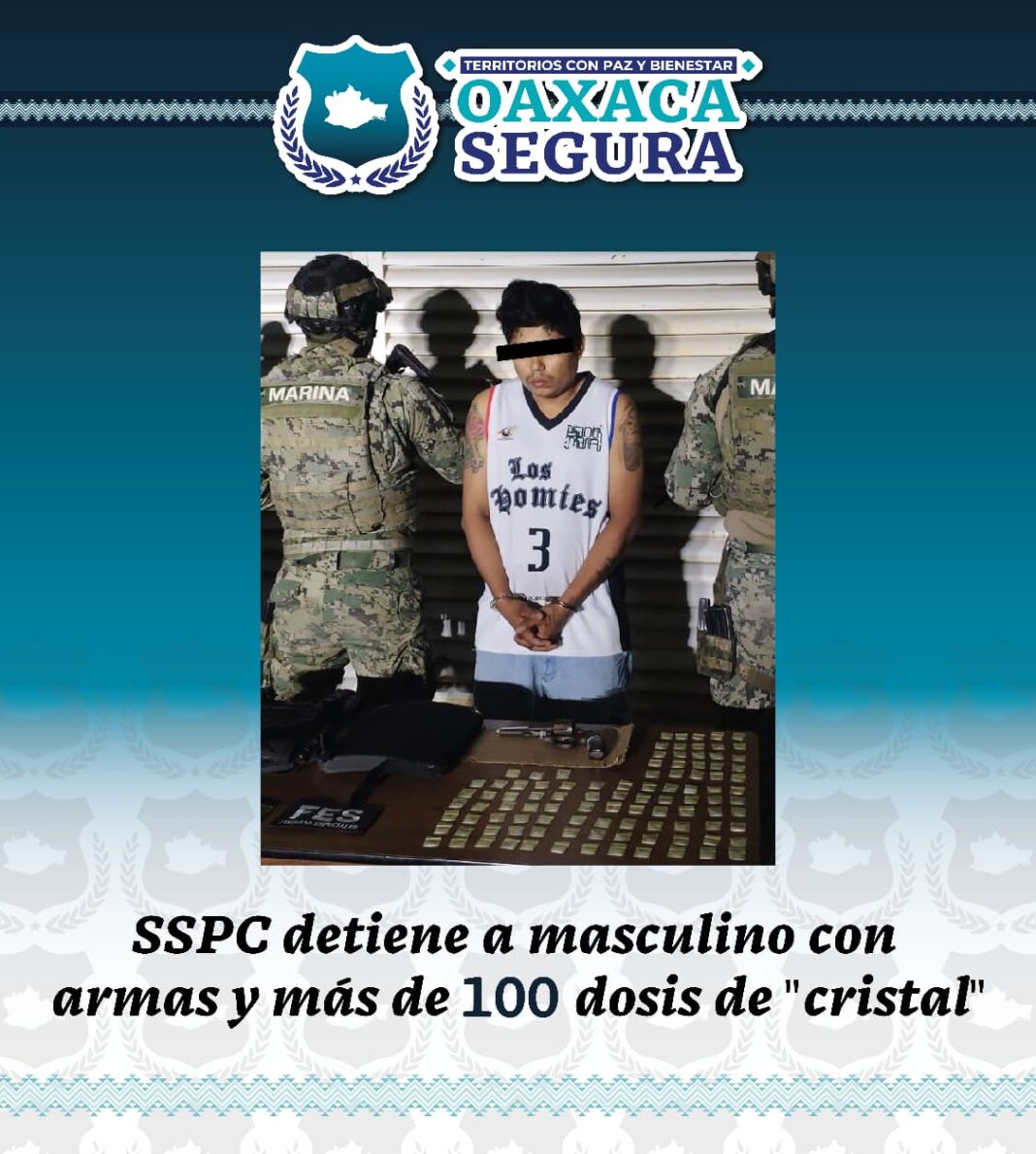 Oaxaca de Juárez, Oax. 30 de enero de 2026.- La Secretaría de Seguridad y Protección Ciudadana (SSPC) a través de la Policía Estatal detuvo a un masculino identificado como U.J.M.D.L.C., por presunta portación ilegal de equipo armamentístico y 100 dosis de drogas, en la localidad de San Juan Bautista La Raya, perteneciente al municipio de Santa Cruz Xoxocotlán.