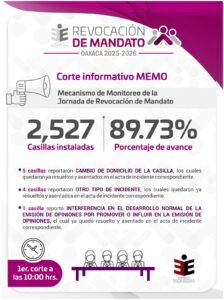 También explicaron que se cuenta con dos herramientas digitales para mantener informada a la ciudadanía en tiempo real. La primera es un formulario operativo para recopilar, transmitir, capturar y sistematizar información estratégica sobre el desarrollo de la Jornada de Revocación de Mandato, el cual funciona con la participación de personas supervisoras y capacitadoras asistentes electorales, así como de las secretarías y presidencias de los 25 Consejos Distritales, quienes remiten la información a la Dirección Ejecutiva de Educación Cívica y Participación Ciudadana del IEEPCO.