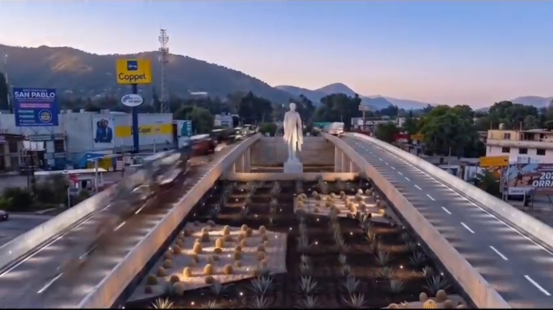 Una obra de gran impacto que transformará el acceso poniente a la ciudad de Oaxaca que contempla 8 carriles (4 elevados y 4 a nivel) y una rotonda donde se elevará el monumento a BenitoJuárez, que modernizará la vialidad en la zona.