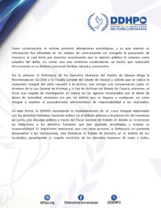 Por lo anterior, la Defensoría de los Derechos Humanos del Pueblo de Oaxaca dirige la Recomendación 02/2026 a la Fiscalía General del Estado de Oaxaca y solicita que se realice la reparación integral del daño causado a la víctima, que incluya una compensación justa, en términos de la Ley General de Víctimas y la Ley de Víctimas del Estado de Oaxaca; asimismo, se inicie una carpeta de investigación en contra de los agentes involucrados por el delito de abuso de autoridad, amenazas y/o por los delitos que se lleguen a configurar, así como integrar y resolver el procedimiento administrativo de responsabilidad a los implicados.