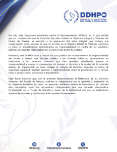 Asimismo, esta DDHPO instó a realizar un acto público de reconocimiento de responsabilidad del Estado y ofrecer una disculpa pública a las víctimas indirectas, reconociendo las violaciones a los derechos humanos que han quedado acreditadas, aceptar su responsabilidad y asumir el compromiso de otorgar el derecho a la verdad de lo ocurrido, además de implementar un curso integral en materia de derechos humanos en temas de seguridad, legalidad, libertad personal y específicamente sobre la prohibición de la tortura, tratos o penas crueles, inhumanos o degradantes.