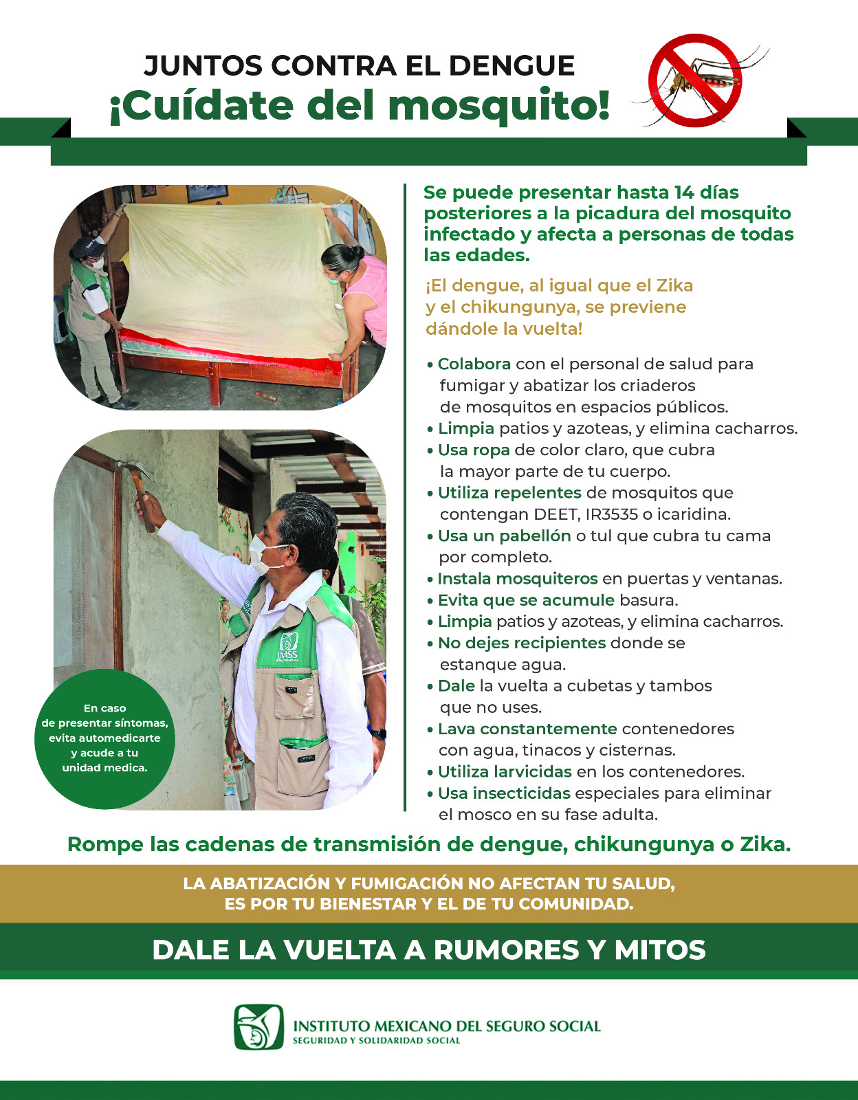 El Instituto Mexicano del Seguro Social (IMSS) en Oaxaca pidió a la ciudadanía adoptar y reforzar medidas básicas de prevención contra el dengue, de acuerdo con las recomendaciones de especialistas en epidemiología, mediante acciones de saneamiento básico, mantener patios limpios y descacharrización, con el objetivo de reducir los criaderos del mosquito transmisor de esta enfermedad.