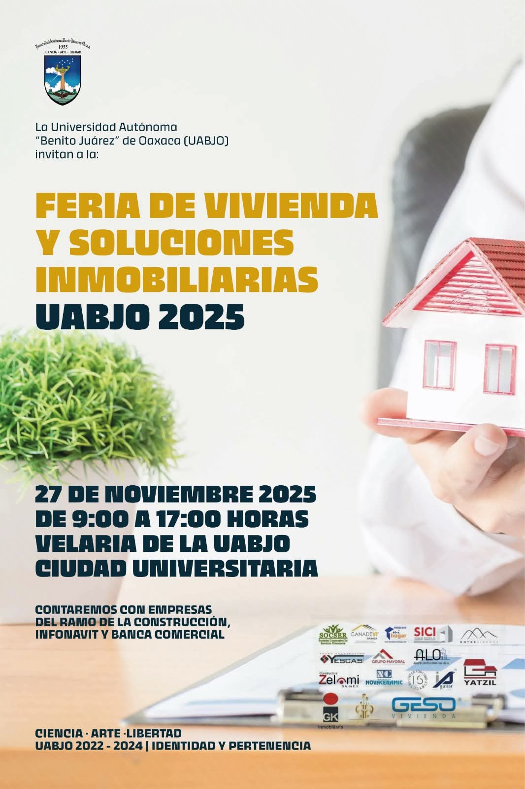La UABJO les invita a formar parte de la “Feria de vivienda y soluciones inmobiliarias UABJO 2025”, que se llevará a cabo el próximo 27 de Noviembre de 9:00 am a 5:00 pm en la Velaria UABJO de Ciudad Universitaria.
