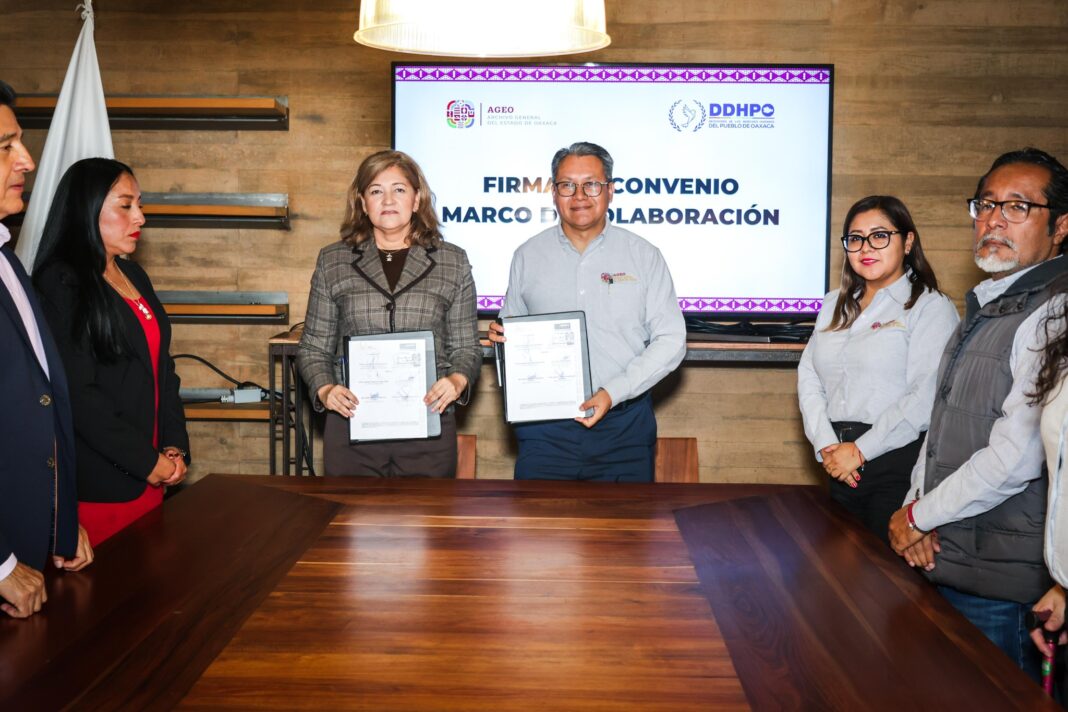 La titular de la Defensoría de los Derechos Humanos del Pueblo de Oaxaca, Mtra. Elizabeth Lara Rodríguez, encabezó la Firma de Convenio de Colaboración entre este organismo y el Archivo General del Estado de Oaxaca, como parte de las acciones orientadas a fortalecer la gestión documental y el manejo responsable de la información pública, reconociendo que un archivo organizado y eficiente es esencial para garantizar la transparencia, la rendición de cuentas y la preservación de la memoria institucional.