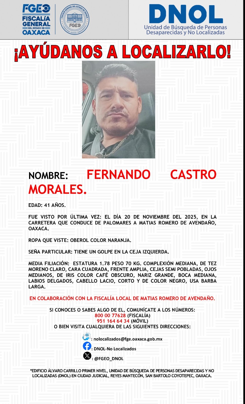 El segundo caso se trata del reporte de la no localización de FERNANDO CASTRO MORALES, con quien perdieron contacto el 20 de noviembre pasado, la víctima es un transportista originario de Tamaulipas, quien viajó a Matías Romero a bordo de una pipa propiedad de la empresa Orozco&Orozco, de acuerdo con la denuncia realizada por las víctimas indirectas.