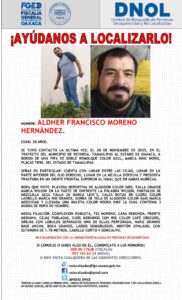 De acuerdo con las denuncias presentadas (una en Matías Romero y la otra directamente en la Vicefiscalía General de Atención a Víctimas y los Derechos Humanos), en el primero de los casos se trata de ALDHER FRANCISCO MORENO HERNANDEZ, quien salió el 18 de noviembre de 2025, de Reynosa, en el estado de Tamaulipas, a bordo de una pipa de la empresa Transportes Nava, y tuvo el último contacto con su familia el 20 de noviembre de 2025, luego de reportar su llegada al Istmo de Tehuantepec.