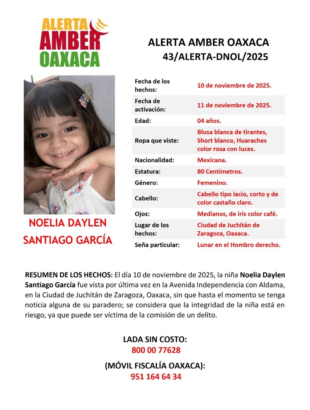 Oaxaca de Juárez a 11 de noviembre de 2025.- La Fiscalía General del Estado de Oaxaca (FGEO) coordina un operativo interinstitucional de búsqueda tras el reporte de no localización de la niña Noelía Dailet Santiago García, de 4 años de edad, vista por última vez el 10 de noviembre de 2025 en Juchitán de Zaragoza. Como parte de las acciones inmediatas, la Institución activó los protocolos de búsqueda con vida y emitió la Ficha de Búsqueda correspondiente para su pronta difusión.