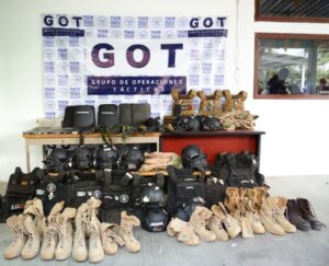 Dentro de los objetos asegurados, están varias armas de fuego, principalmente fusiles de asalto, así como ciento de cartuchos útiles, además de equipo táctico consistente en chalecos, botas, uniformes y cascos, entre otros objetos constitutivos de delito.