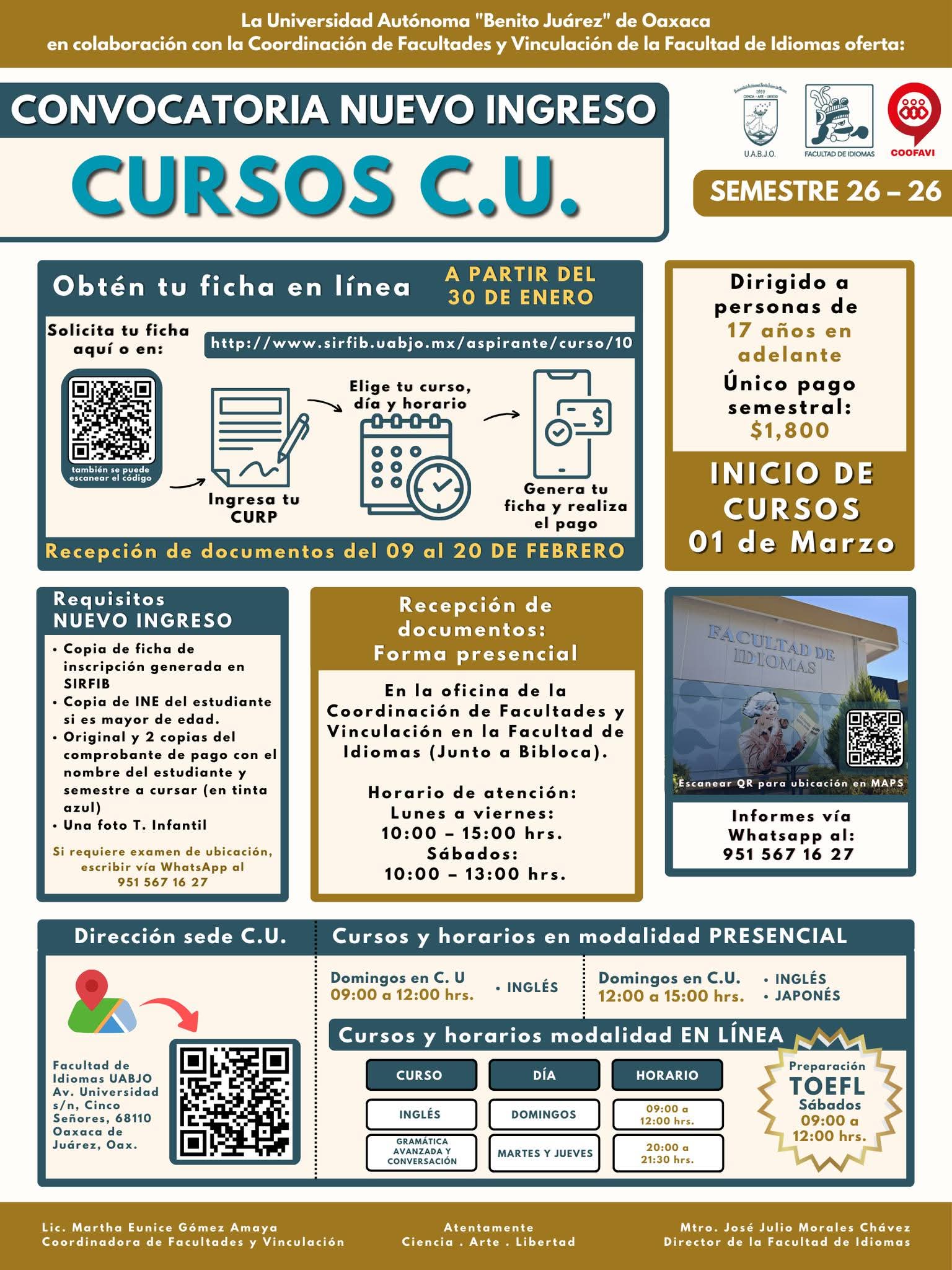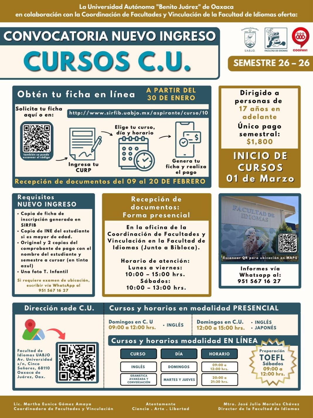 La UABJO les invita a formar parte de los cursos DOMINICALES C.U y opciones en modalidad EN LÍNEA en el semestre 2026 – 2026, para los cursos de inglés, gramática avanzada y conversación, japonés y preparación para examen TOEFL.