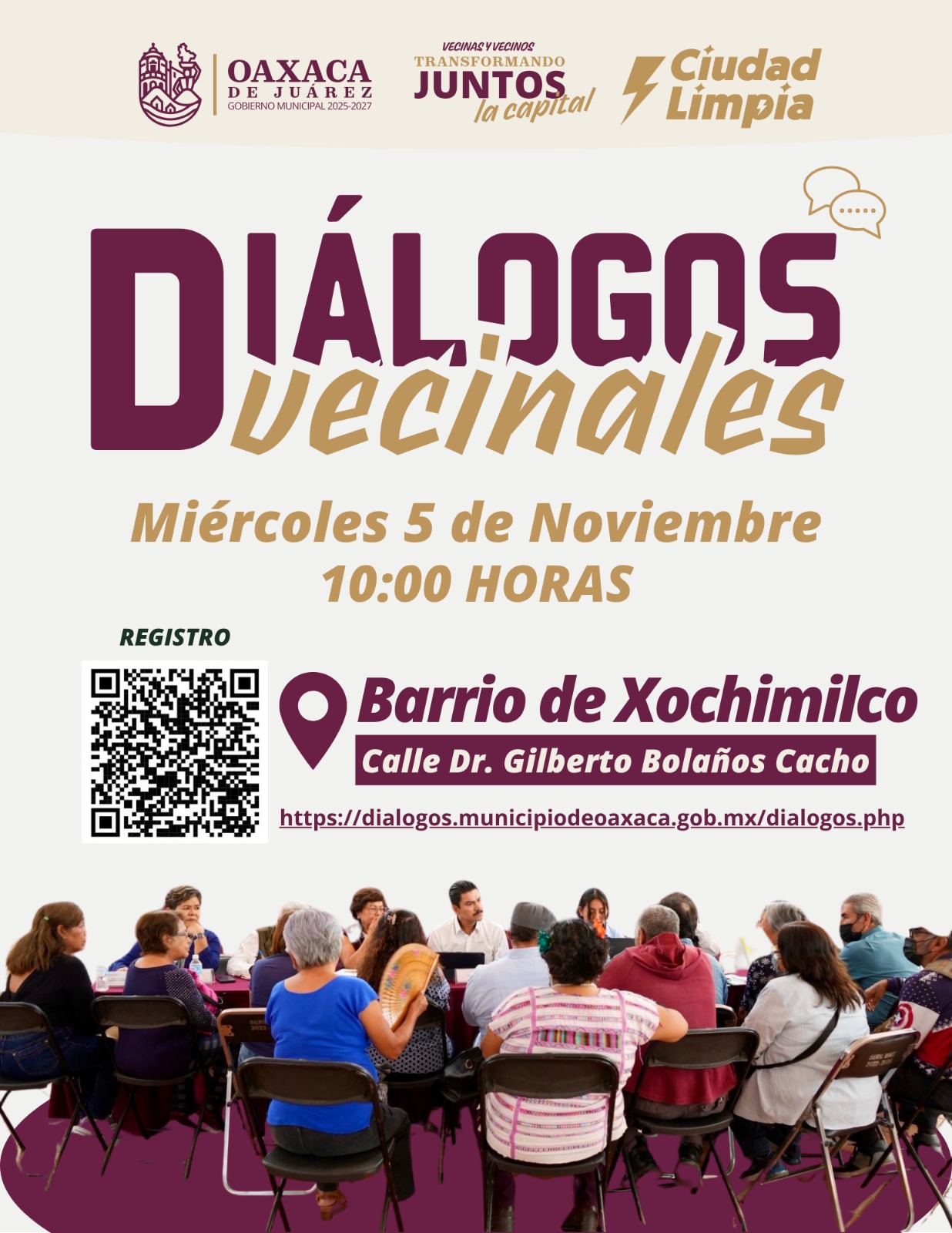 Oaxaca de Juárez, Oax., 5 de noviembre de 2025.- El Municipio de Oaxaca de Juárez invita a las y los ciudadanos a participar en una nueva jornada de Diálogos Vecinales, que se llevará a cabo este miércoles 5 de noviembre a las 10:00 horas en el Barrio de Xochimilco, sobre la calle Dr. Gilberto Bolaños Cacho.