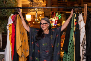 Ángela Dillon: Vestidos, faldas, capas y abrigos. Me gusta combinar rayas con flores, texturas con contrastes. En esta colección trabajamos con algodón e ikat guatemalteco (parecida al lino), materiales nobles que respiran con el cuerpo. Son prendas que, más que cubrir, acompañan. Mi esposo dice que entre mi pintura y mi ropa no hay diferencia, y tiene razón: todo está ligado por el color, la forma y la emoción.
