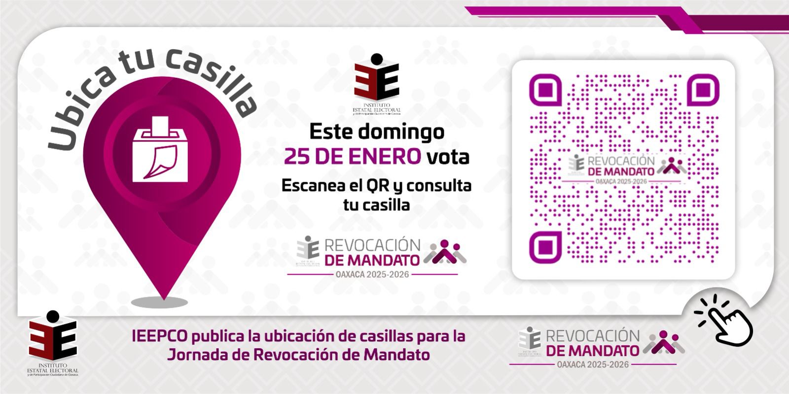 El Instituto Estatal Electoral y de Participación Ciudadana de Oaxaca (IEEPCO) informa que, en cumplimiento al calendario aprobado por el Consejo General, a partir de este momento ya se encuentra disponible en la página oficial de este órgano electoral la información correspondiente a la ubicación de las casillas para la Jornada de Revocación de Mandato.