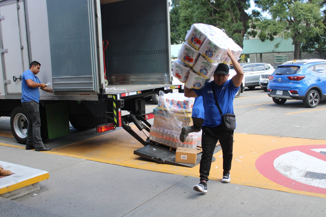 A lo largo de esta semana, trabajadoras y trabajadores del IMSS en la Ciudad de México Norte continuarán con la carga y envío de camiones que transportan materiales como shampoo, jabón en barra, pasta dental, pañales, toallas sanitarias, cloro, jabón en polvo, agua embotellada, latas de atún, arroz, frijoles, leche en polvo, avena, entre otros insumos de primera necesidad.