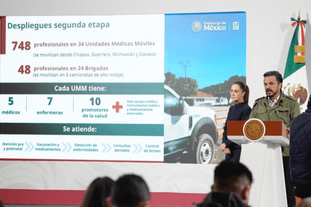 Refirió que hoy comienza la segunda etapa de la atención, con el despliegue de 748 profesionales de la salud en otras 34 Unidades Médicas Móviles, provenientes de Chiapas, Guerrero, Michoacán y Oaxaca, así como a 48 profesionales en 24 brigadas.