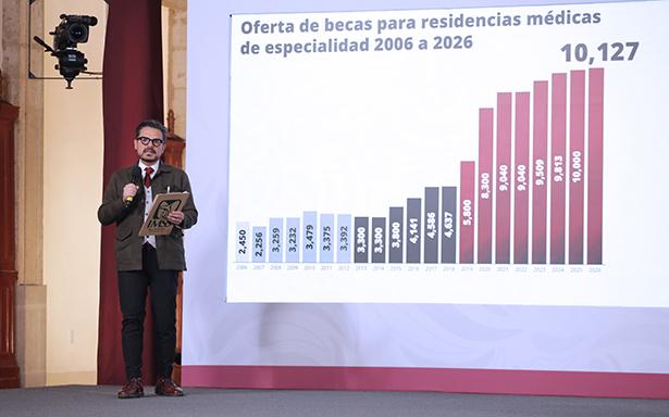 Indicó que en años anteriores en el IMSS se ofertaban menos lugares, por ejemplo, en 2006 eran 2 mil 450 becas; en 2013 eran 3 mil 300 y en un periodo de 12 años sumaron cerca de 44 mil becas; a partir de 2019, el Instituto inició una estrategia decidida de fortalecimiento de la formación médica especializada. Ese año se incrementó la oferta a 5 mil 800 becas; en 2020, el número ascendió a 8 mil 300, y desde entonces el crecimiento ha sido sostenido y progresivo.