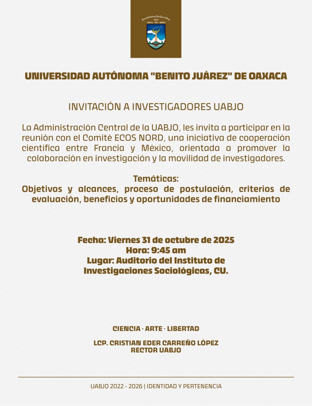 A los Investigadores e Investigadoras UABJO, les invitamos a participar en la reunión con el Comité ECOS NORD, el día 31 de Octubre a las 9:45 am, en el Auditorio del Instituto de Investigaciones Sociológicas.