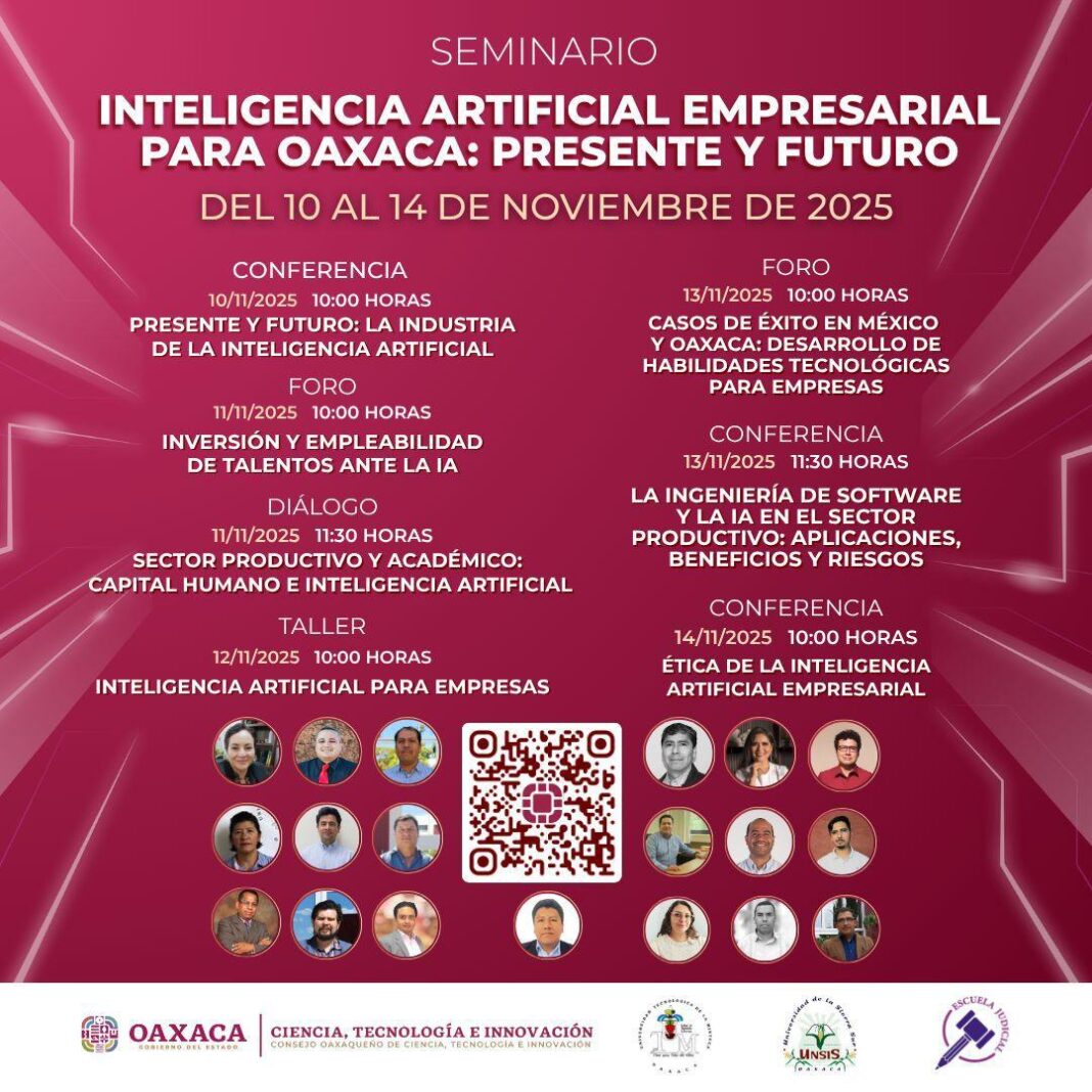 Oaxaca de Juárez, Oax. 22 de octubre de 2025.- El Consejo Oaxaqueño de Ciencia, Tecnología e Innovación (Cocitei) invita al seminario Inteligencia Artificial Empresarial para Oaxaca: presente y futuro, a realizarse del 10 al 14 de noviembre, próximo.