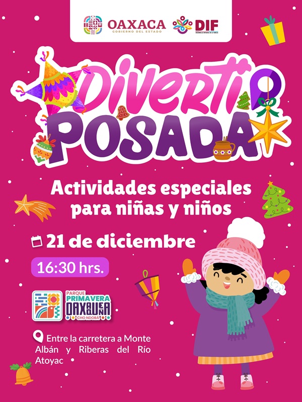 Oaxaca de Juárez, Oax. 16 de diciembre de 2025.- Con motivo de las fiestas decembrinas, el Sistema para el Desarrollo Integral de la Familia (DIF) Oaxaca invita a niñas, niños y familias a participar en la Diverti Posada, que se llevará a cabo el domingo 21 de diciembre a partir de las 16:30 horas.