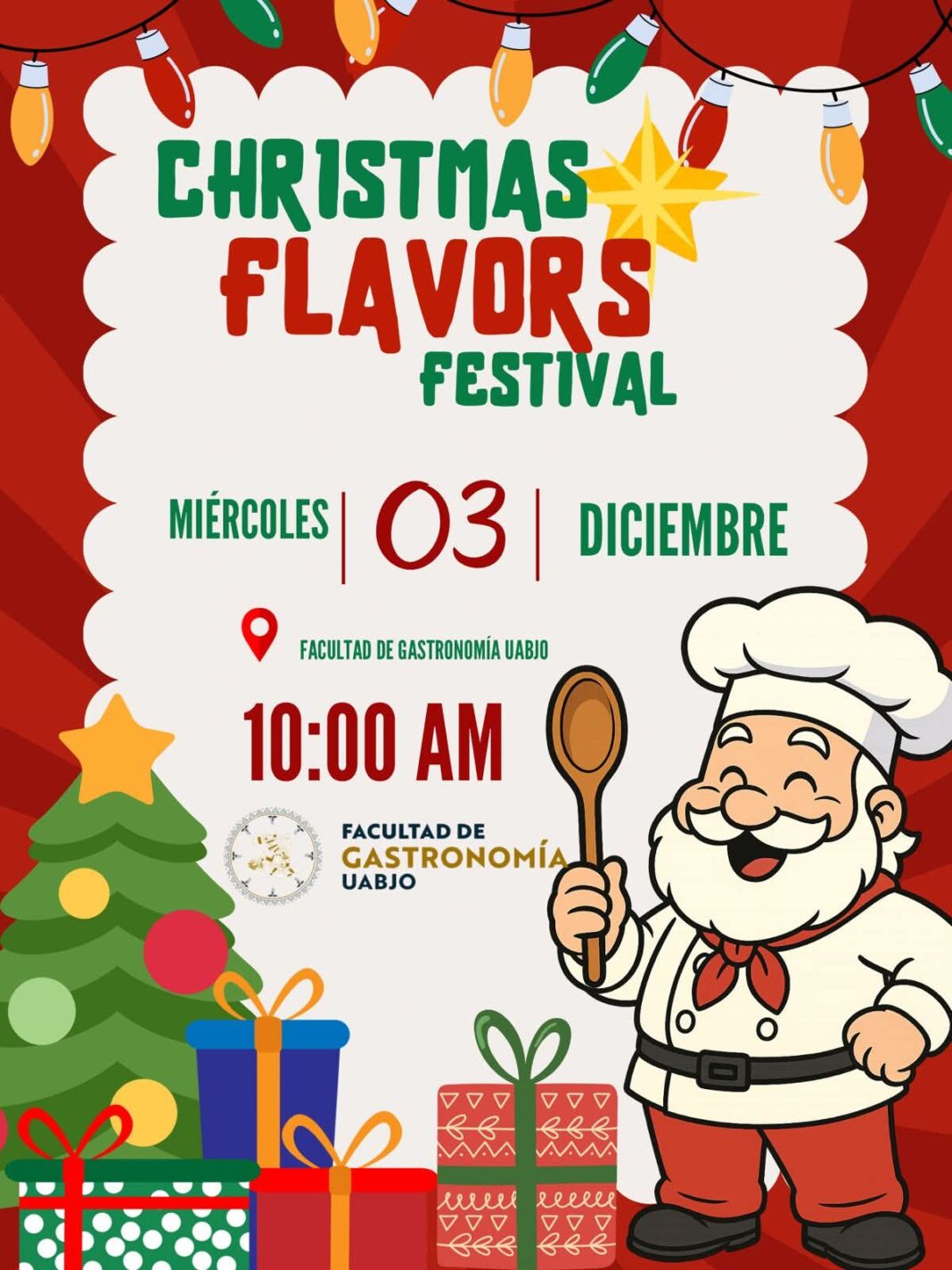 Este 3 de diciembre se realizará el Festival de sabores navideños (Christmas Flavors Festival), el cual está abierto a la comunidad universitaria y al público en general, informó el Director de la Facultad de Gastronomía de la Universidad Autónoma “Benito Juárez” de Oaxaca (UABJO), Mtro. Mauricio Arias Carrasco.